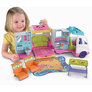 Your child will enjoy taking her dolls on a beach vacation in the Fisher Price Loving Family Beach Vacation Mobile Home. The fully loaded RV, with its working wheels, opens up wide to reveal five large rooms, including a living room, sleeping quarters, bathroom, and kitchen. Accessories include a picnic table, lounge chairs, and a sand castle, creating the ideal family beach vacation.
